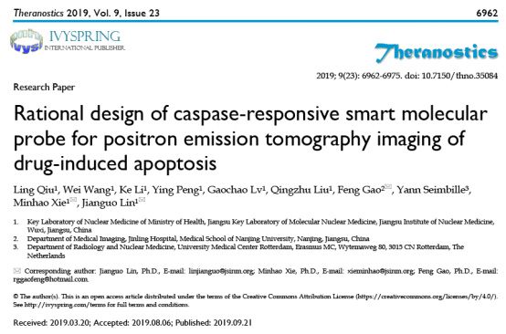 近日,我所創(chuàng)新藥物研究中心林建國團(tuán)隊(duì)在生物醫(yī)學(xué)1區(qū)雜志《Theranostics》(影響因子8.063)上發(fā)表論文,報(bào)道了一種具有Caspase響應(yīng)型的智能正電子發(fā)射斷層掃描(PET)顯像探針,可用于腫瘤的早期凋亡顯像,將為臨床腫瘤治療的早期療效評(píng)價(jià)提供新技術(shù)。