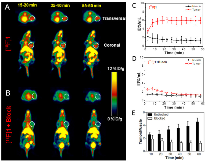 在生物素受體過表達的肺癌A549和宮頸癌Hela動物模型中,分子探針[18F]1給藥15分鐘后即可獲得高靶本比的PET圖像,60 min時腫瘤/肌肉靶本比仍大于4;而在生物素受體低表達的結腸癌HCT116荷瘤鼠中,探針[18F]1對腫瘤幾乎無顯像能力,說明該分子探針具有良好的特異性。對于缺失生物素靶向基團或沒有還原自組裝功能的對照探針[18F]1a和[18F]1b,難以在生物受體過表達的腫瘤中進行富集,說明腫瘤靶向和自組裝協同策略可有效提高PET分子探針的顯像效果。該策略對設計發展新一代核素靶向診療藥物具有重要的參考價值。