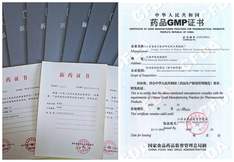 | 99Tcm雙半胱氨酸注射液 | 1998 | 國家一類新藥證書、(98)衛藥證字X-92 |